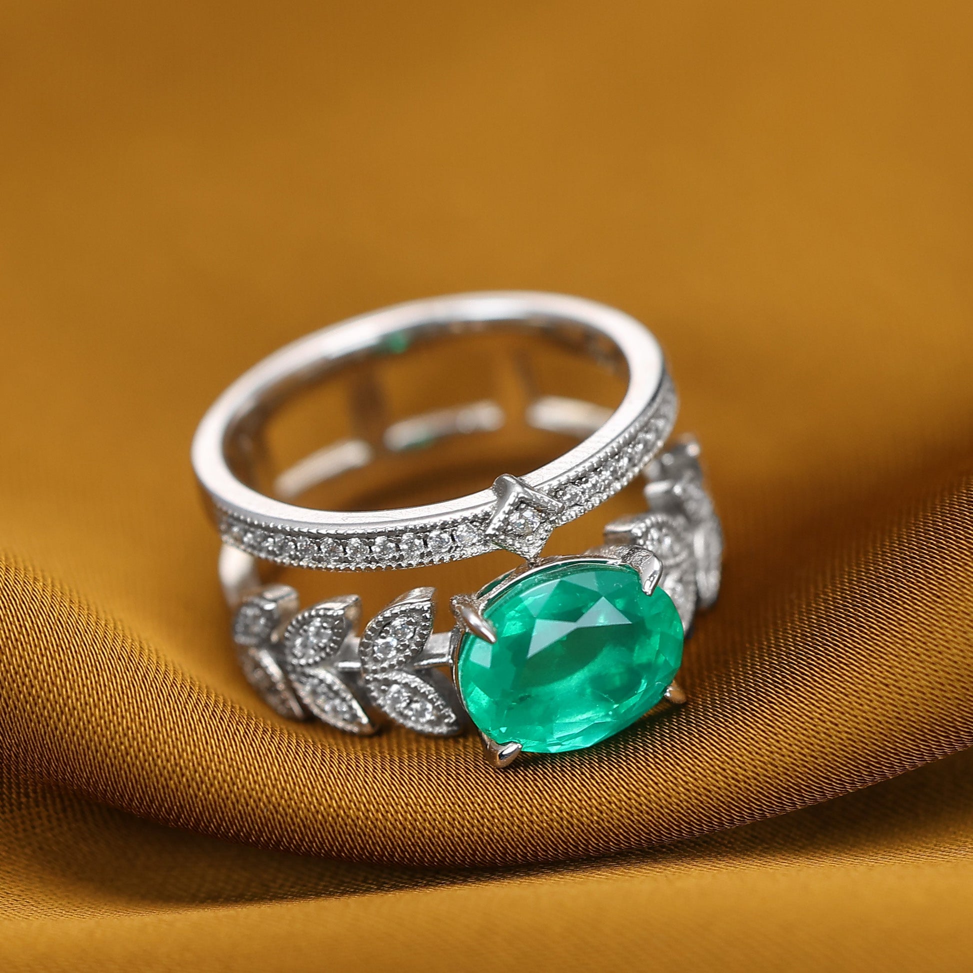 Micro-setting Emerald color Lab created stones Fashion pigeon egg double row ring, sterling silver. (2.92 carat)