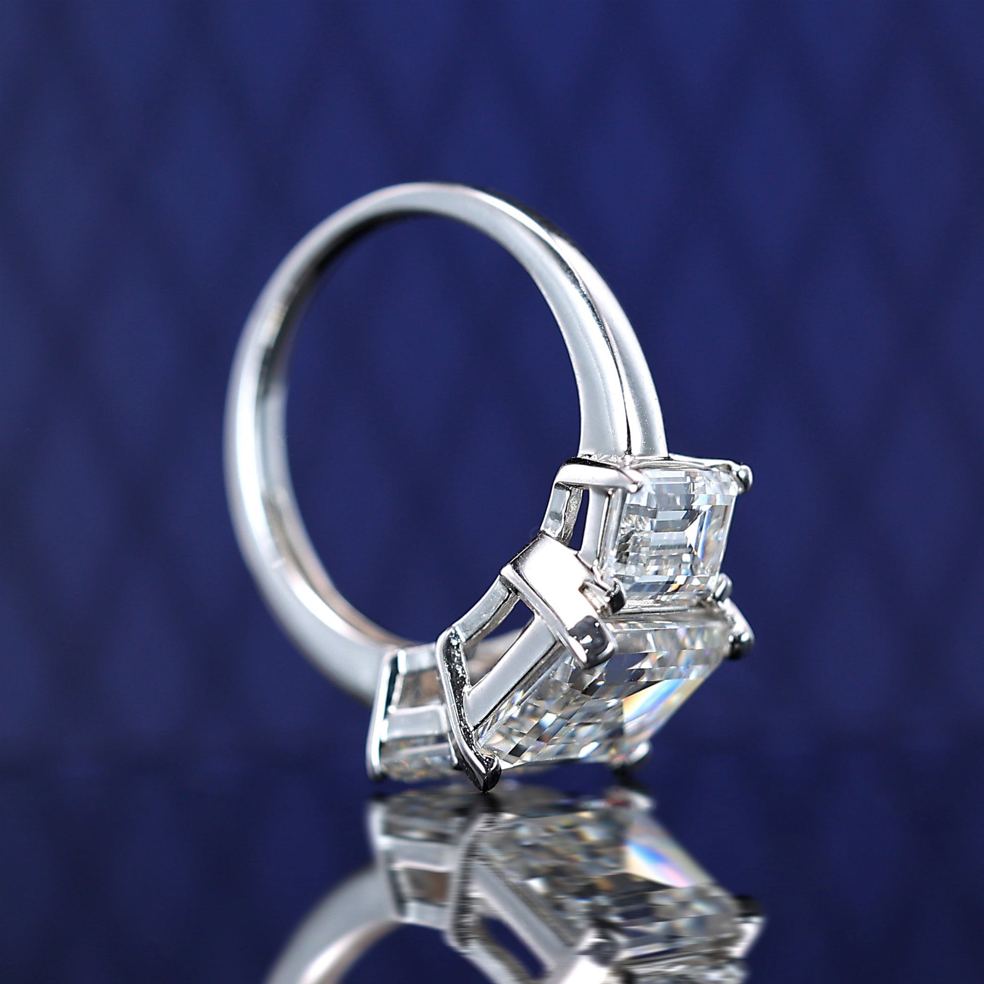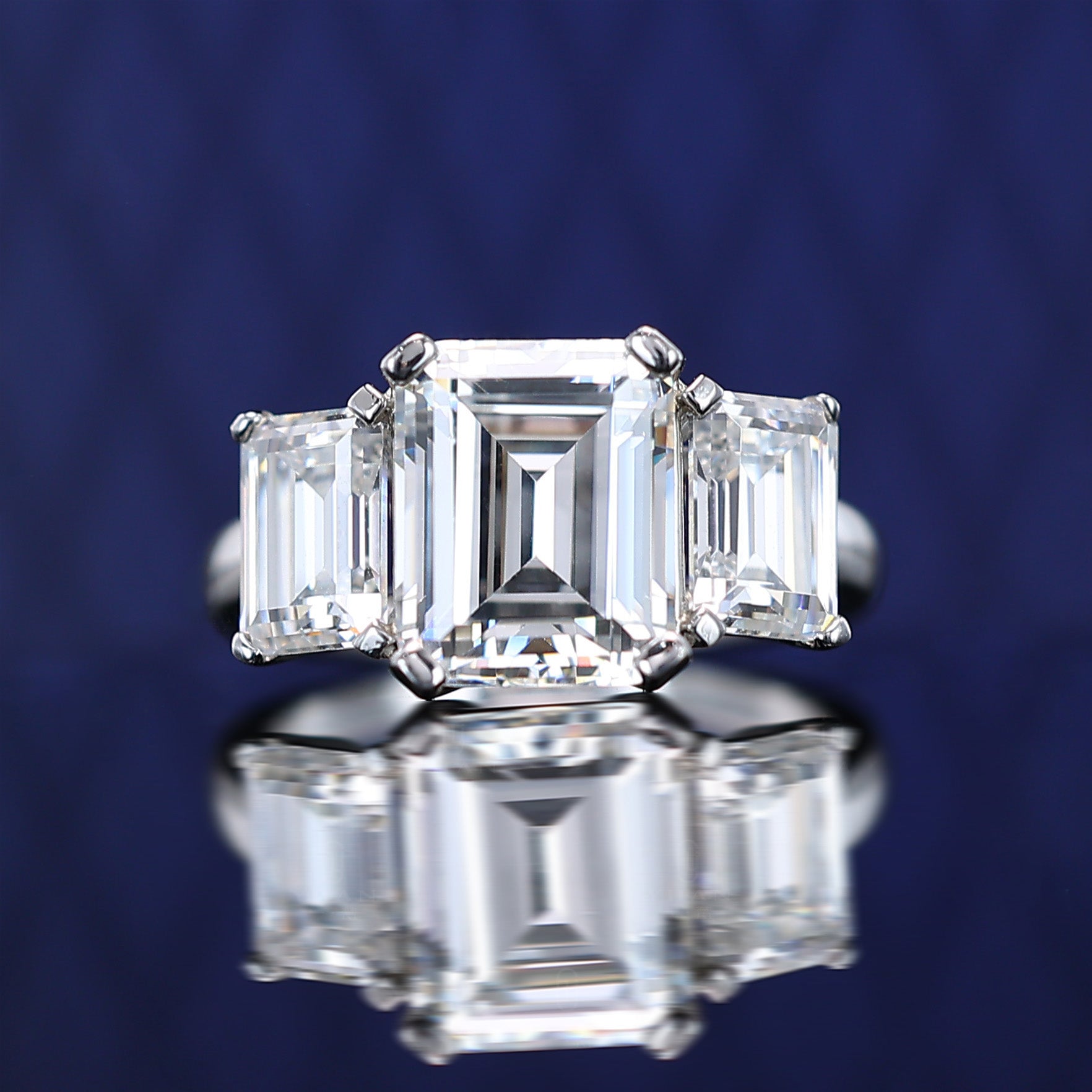 Micro-setting emerald-cut Lab created 3 stones ring, sterling silver .