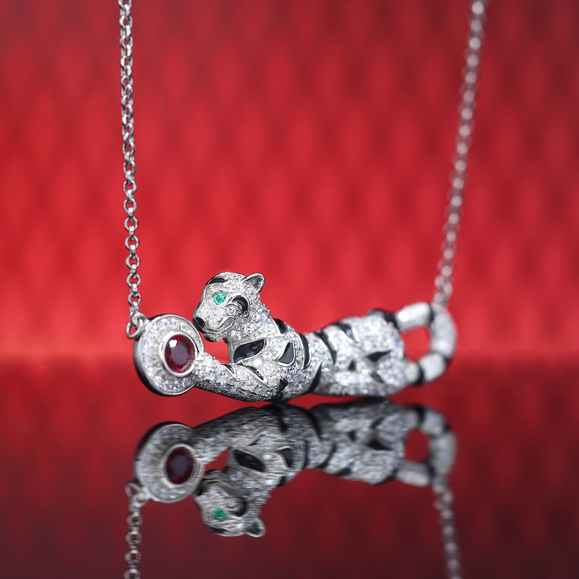 Micro-setting Lab created stones Black striped leopard necklace, sterling silver