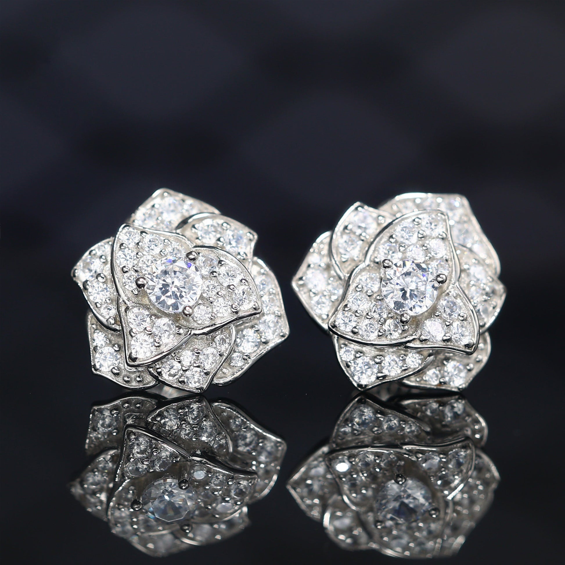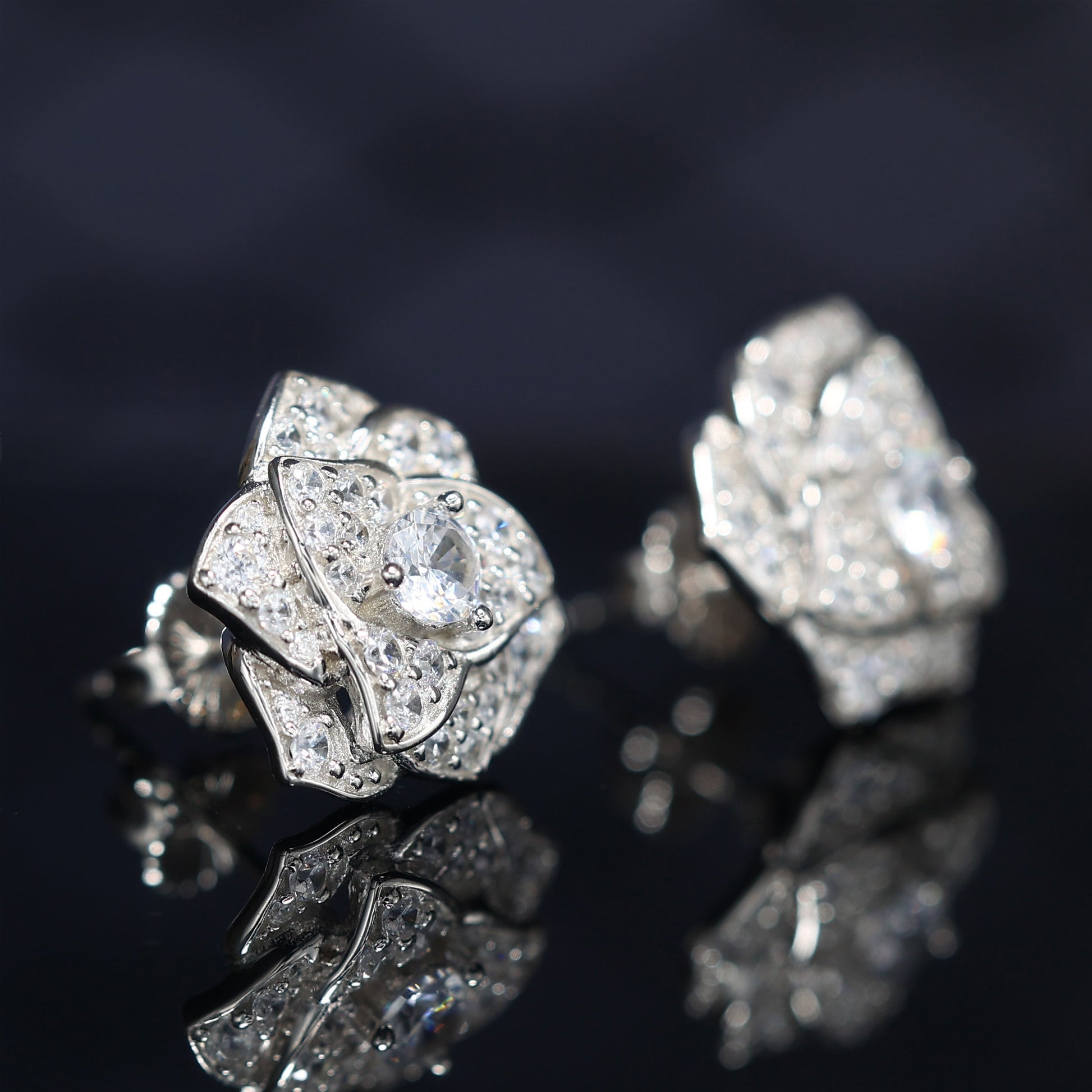 Micro-setting Lab created stones Camellia ear studs, sterling silver.