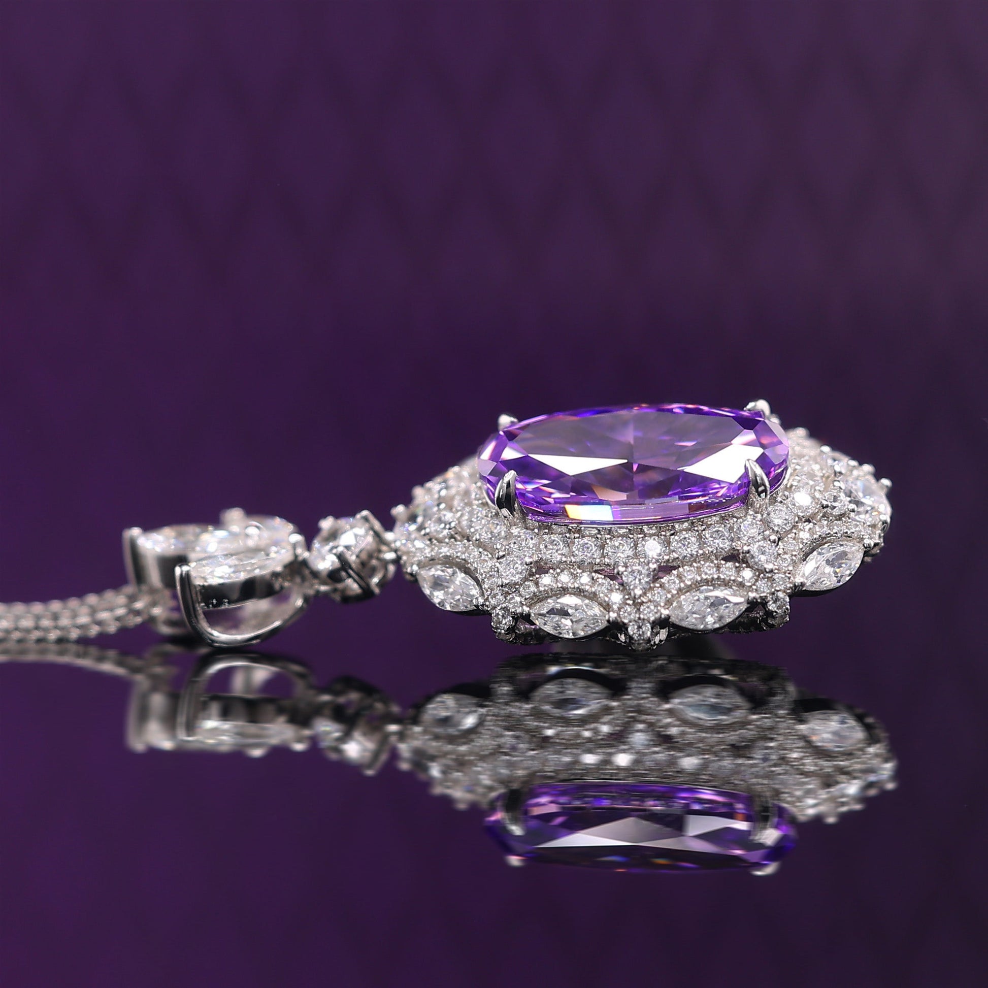 Micro-setting Purple color horse eye shape Lab created stones necklace, sterling silver.